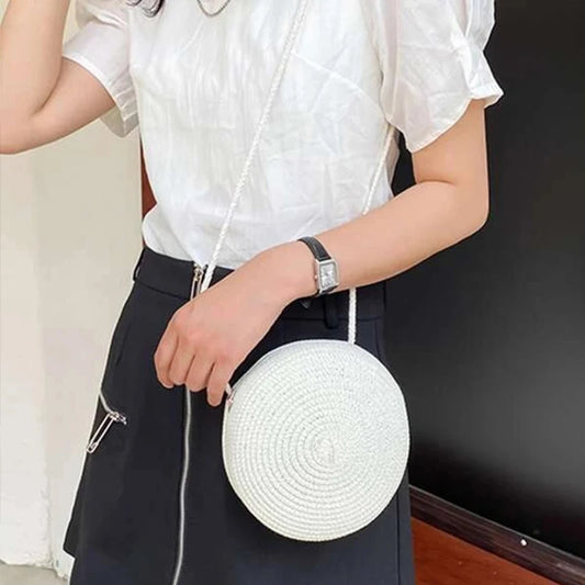 Mała słomiana torebka do ręki z paskiem i ozdobnymi węzłami