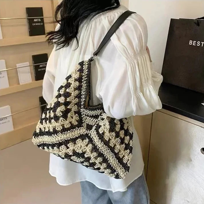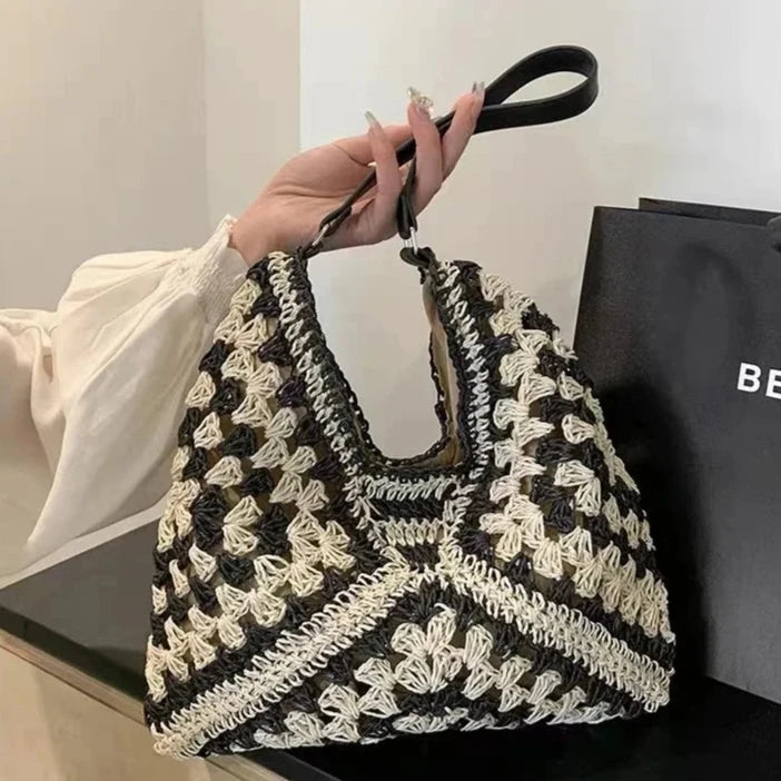 Zachwyć się lekkością i designem, który przyciąga wzrok! Ta dwukolorowa torba słomiana to idealne połączenie natury i geometrii – klasyczna forma została wzbogacona o oryginalny wzór i kontrastowe kolory, tworząc unikalny dodatek w stylu boho z nutą nowoczesności.
