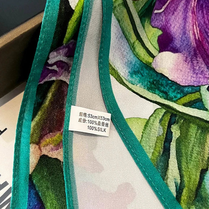 Podkreśl swoją kobiecość i styl z delikatną, jedwabną apaszką, ozdobioną pięknym, kwiatowym wzorem w odcieniach fioletu i zieleni. To wyjątkowy dodatek, który doda klasy i świeżości każdej stylizacji.